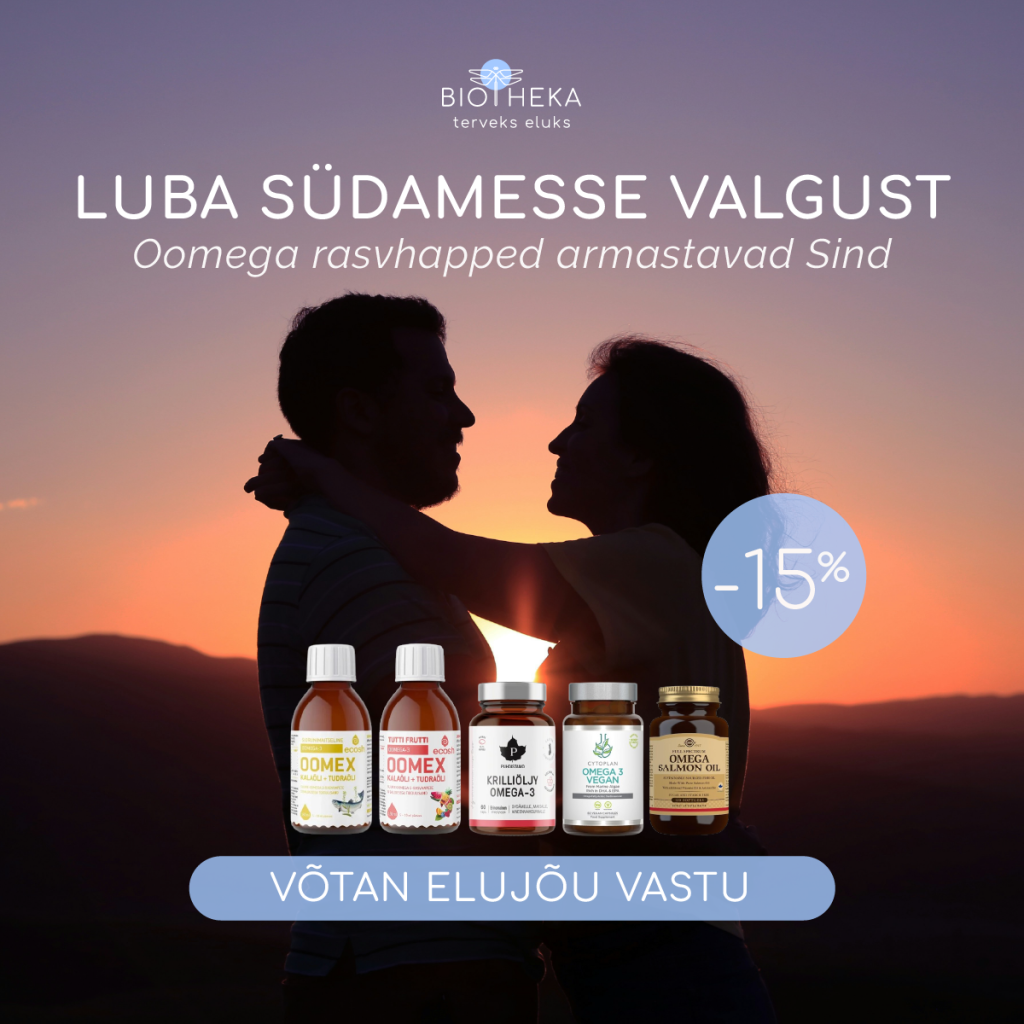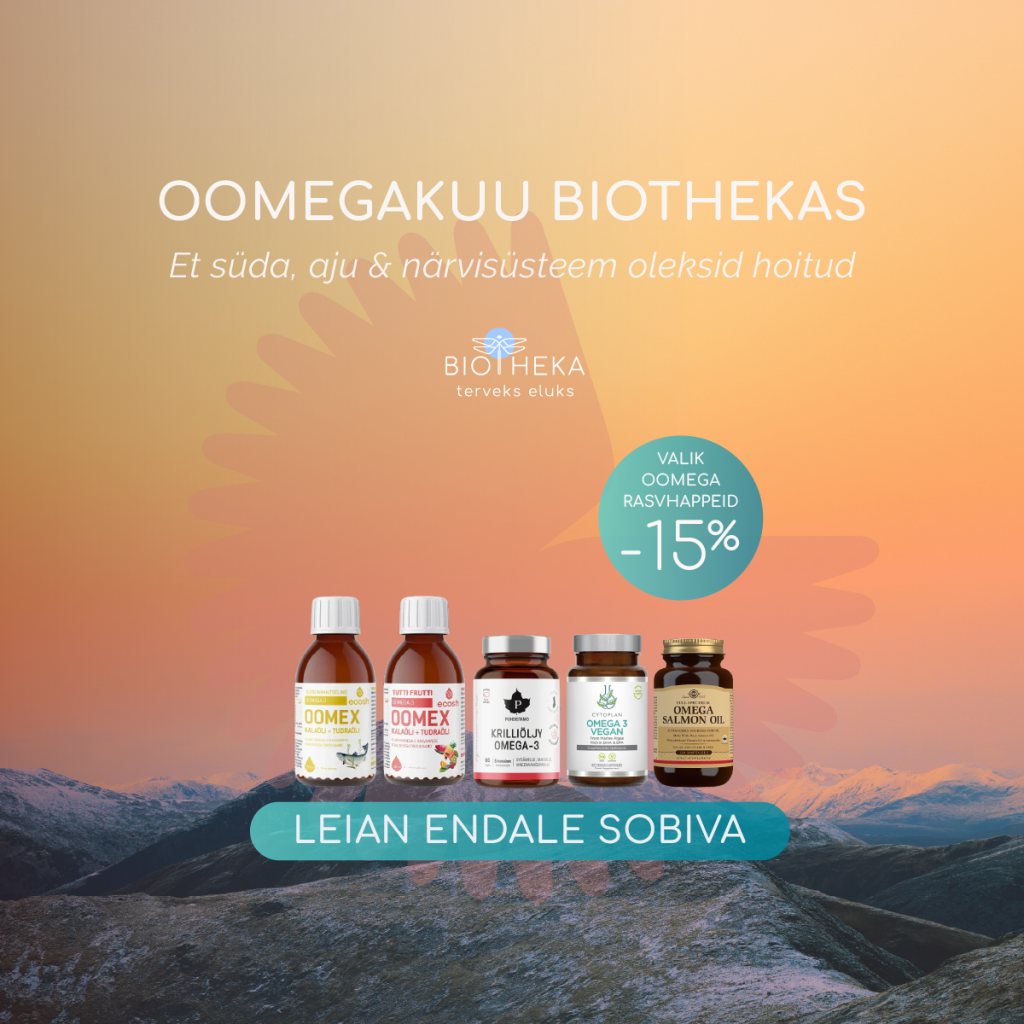 - Aju ja närvisüsteem, Aju tervis, Immuunsus, Keskendumine, Lapse tervis, Luustik, liigesed, lihased, Mälu, Mehe tervis, Nahk ja küüned, Oomega kampaania -15%, Oomega rasvhapped, Põletikuvastane, Spordi toidulisandid, Südame tervis, Teadlik vananemine, Vitamiinid lastele
