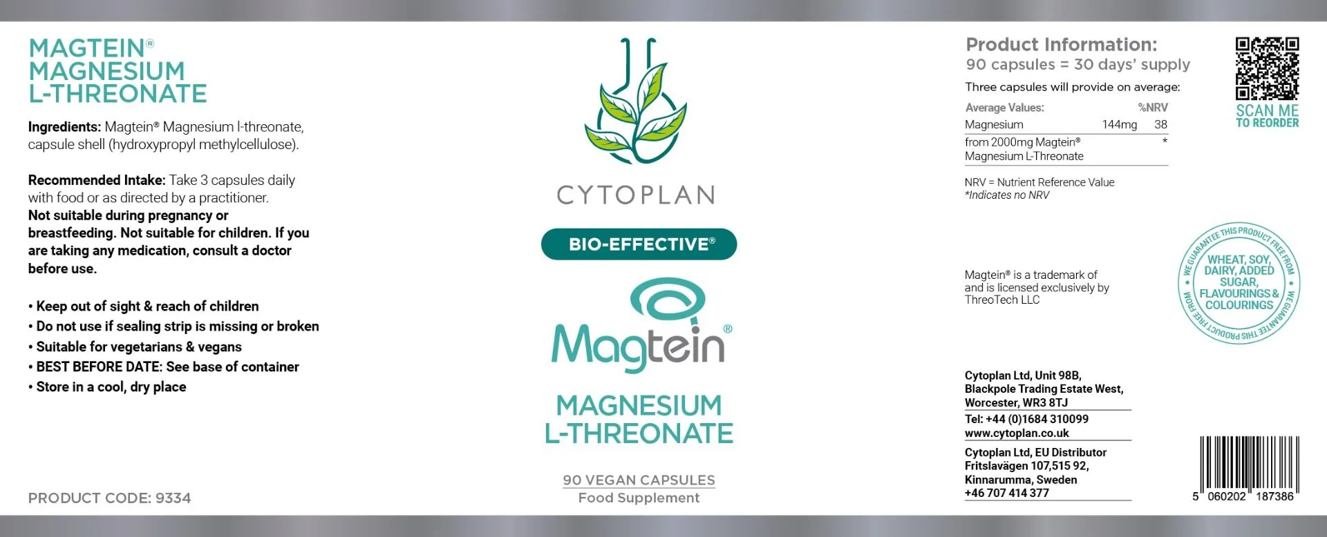 Magtein® MAGNEESIUM-L-TREONAAT, 90 kapslit. Cytoplan Magtein® Magnesium L-Threonate